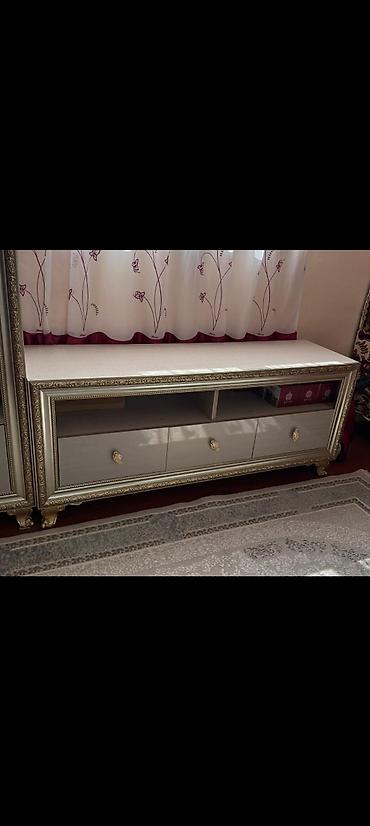 - TV tumbası: Üstü geniş, ön hissədə 3 çekmece və 2 açıq bölmə. Çərçivə və ayaqlar klassik qızılı ornamentlərlə işlənib.