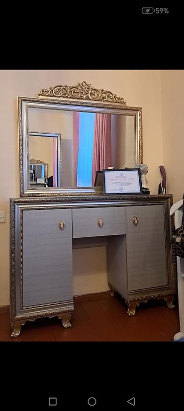- Konsol-güzgü: Geniş güzgü dekorativ qızılı çərçivə və başlıqla. Aşağı hissə 2 yan dolab, mərkəzdə çekmece və açıq ayaqaltı boşluqdan ibarətdir. Qızılı rəngli dekorativ tutacaqlar və relyefli plintuslar.
