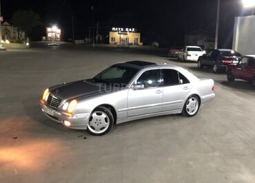 Mercedes-Benz E-Class (W210) sedan - Kuzov: sedan, gümüş rəng - Mühərrik: benzin ehtimalı (E-Class W210), önqapı havalandırma ızgaralı klassik dördyuvarlaq fara dizaynı - Transmissiya: avtomat (mə...