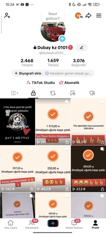 Xidmət: TikTok profili və kontent səhifəsi Səhifə adı və istifadəçi adı: 019 – @b1r.skroniy Statistika: 6.747 izləyici, 438K bəyənmə Profil mətni: “ARD-ARDA BƏYƏNMƏ 8K – We Are The Legend Of A...
