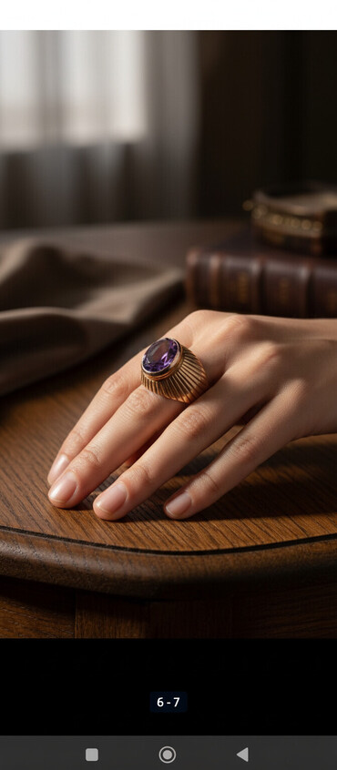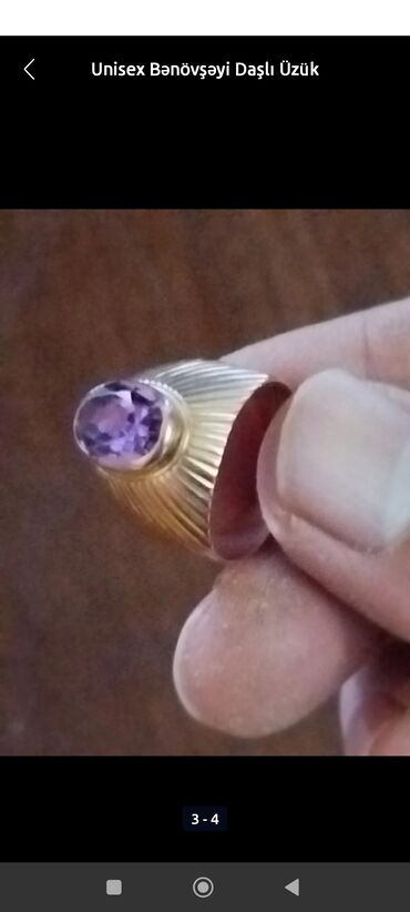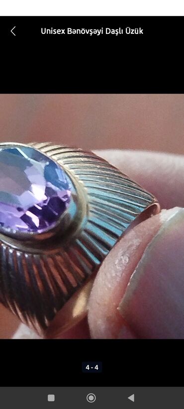 Tebii ametist daş, gümüş 925prob, kişi üzüyü. Əl işi qızılı kaplama elementlər ve mina ile bezenilib. Dəbli görünüşü ilə fərqlənir və xüsusi günlərdə istifadə üçün idealdır.
