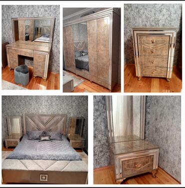 Yataq otağı dəsti – modern dizayn, açıq boz tonlarda Komplektə daxildir: - 160x200 sm ölçülü rahat çarpayı (yumşaq başlıq, taxta əsaslıq) - 2 ədəd tumbə (yan şkafça) - 4 qapılı qarderob: iki aynal...