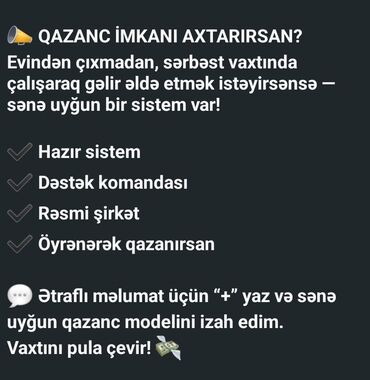 - Sistemli əməkdaşlıq imkanı barədə elan mətnində qeyd: hazır sistem, dəstək komandası və rəsmi şirkətlə öyrənərək qazanmaq fürsəti mövcuddur.