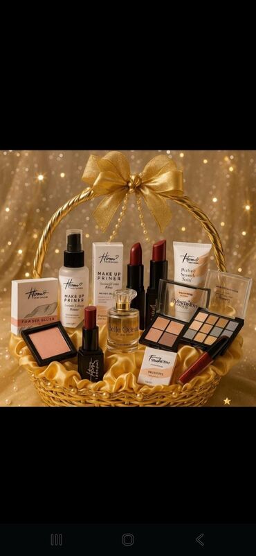 - Hədiyyə səbəti variantı: qızılı bəzəkli səbətdə qarışıq Homm? məhsulları — makiyaj bazası, səth hamarlaşdırıcı krem (Perfect Smooth Skin), iki fərqli dodaq boyası, parfüm, göz kölgəsi palitraları, rumyana/pudra, dodaq parladıcısı və s. Şənlik və xüsusi günlər üçün zərif təqdimat.