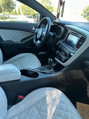 Kia Optima – ağ rəngli, sedan kuzov. Fotoşəkillərdə görünən komplektasiya və xüsusiyyətlər: