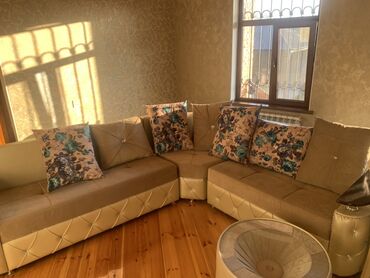 Künc divan dəsti tecili kocle bagli satilir bazalidi - 2 hissədən ibarət L formalı künc divan - Krem rəngli eko‑dəri korpus, üzərində bej rəngdə naxışlı parça örtüklər - Yumşaq oturacaq və arxalıq...