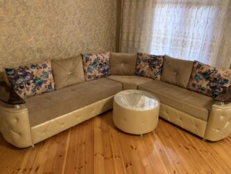 - Dizayn: L‑şəkilli künc divan; yumşaq bej/qəhvəyi oturacaq və kürəklik, alt hissədə krem rəngli kapitone işləmə və dekorativ düymələr.