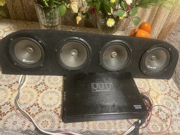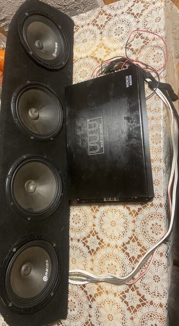 - Gücləndiricinin üzərində “wudi car audio” və “WD628 6800W” işarələri var, dinamiklər “Reiss” brendli olaraq göstərilir.