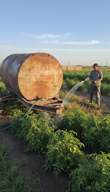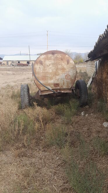 Traktor Qoşqusu üzərində su/Maye çəni - İki təkərli qoşqu şassisi üzərində silindrik metal çən - Rəng: mavi - Ön hissədə traktor üçün halqalı qoşma başlığı - Yarpaq yaylı asqı və iri off-road təkə...