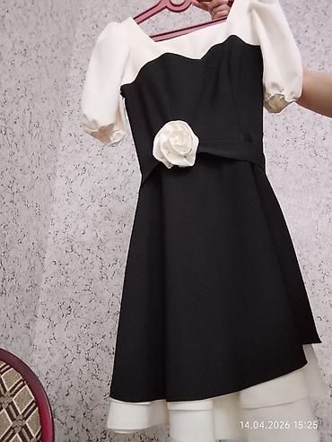 Qara-ağ kokteyl donu - Model: qara rəngdə, ətəyi ağ büzməli haşiyə ilə ikiqat görünüşlü A-kəsim. - Üst hissə: incə çiyin qayışları + açıq çiyin effektli qapaq qol detayı; yuxarı kənarda nazik ağ h...
