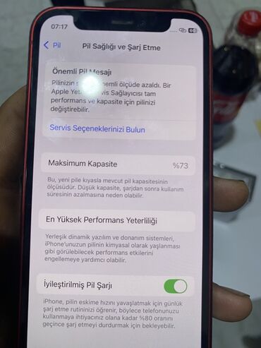 - Batareya sağlamlığı: Maksimum tutum 73% (iOS xəbərdarlığı göstərilir), “İyileştirilmiş Pil Şarjı” aktivdir