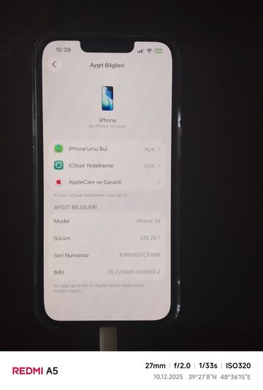 - Cihaz məlumatları ekranında model (iPhone 14), seri nömrəsi və IMEI göstərilir.