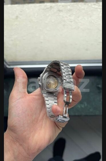 Patek Philippe saatı – Nautilus üslubunda, polad qolbaqlı, avtomatik mexanizmli model. Xüsusiyyətlər: - Korpus və qolbaq: paslanmayan parlaq polad, inteqrə olunmuş metal qolbaq, qatlanan kilid - M...