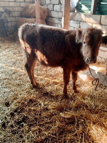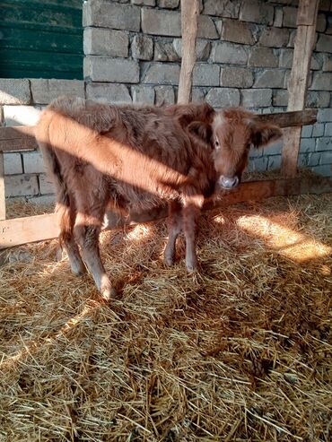 Satlıq buzov - Növ: iri buynuzlu heyvan, buzov - Rəng: açıq-qonur (qəhvəyi) tonlarda, alnında açıq ləkələr - Yun örtüyü: qalın və dalğalı, soyuğa dözümlü - Qulaqda nişan/etiket görünür - Bədən qur...