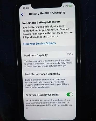- Batareya sağlamlığı bölməsində maksimum tutum 77% göstərilir; Optimized Battery Charging aktivdir