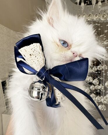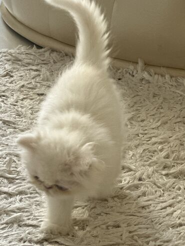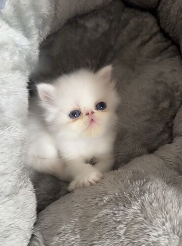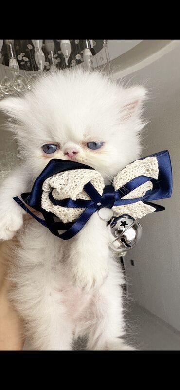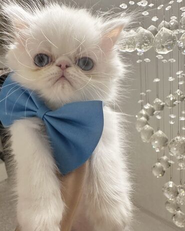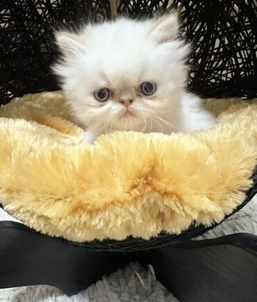 Şəkillərdə pişik balası evdə, yumşaq yataqda və aksesuarla göstərilib. Ekzotik/Persian tipli estetik görünüş, sakit xarakter və ailə mühitinə uyğun bir dost axtaranlar üçün uyğundur.