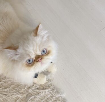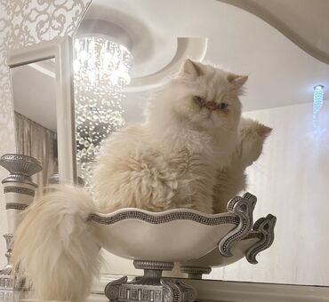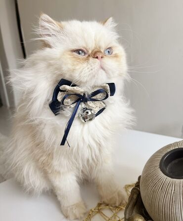 Saf ağ krem rəng çalarında, uzun və qalın tüklü, yastı üz quruluşuna və iri mavi gözlərə malik pişik. Ekzotik/örtülü pers tipli görünüş, qısa pəncələr və tüklü quyruq. Şəkillərdə bantlı/zınqırovlu yaxalıqla rahat poz verir, ev şəraitinə uyğun sakit və aristokrat xarakter təsiri bağışlayır.