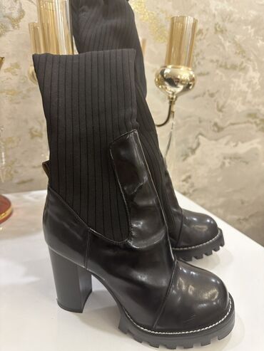 - Material: üst hissə parlaq dəri; baldır hissəsi elastik, şaquli rellefli trikotaj