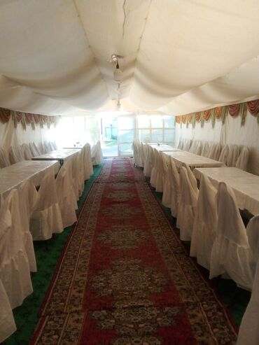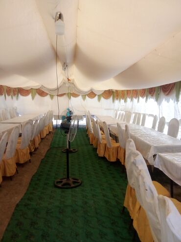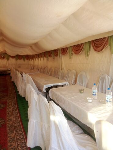 - Masa‑stul komplekti: hər iki tərəfdə düzülmüş uzun düzbucaqlı masalar, üzərində sudan qoruyan örtüklər; stullar üzlüklə təmin olunub.