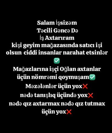 KişiGəncə şəhərində iş axtarıram.maaş 60 700 800 Azn olsa lap əla olardı 099.360.92.00 Kişi geyimləri mağazasında satıcı Ailəvi geyim mağazalarında olar ama qadın geyim mağazası yox❌️ gəncəliyəm goranboy rayon dəliməmmədli kəndində qalıram