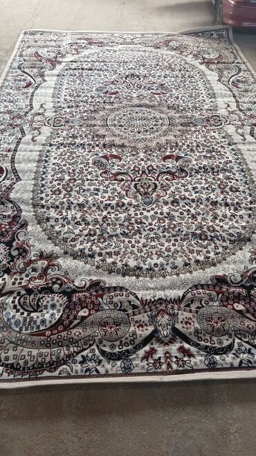 Xalça – klassik oriental naxışlı, iri ölçülü - Rəng palitrası: açıq krem/ağ fon üzərində tünd mavi, boz, şərab rəngi və qrafit tonlarında ornamentlər. - Dizayn: mərkəzdə medalyon kompozisiyası, ətr...