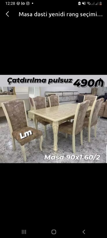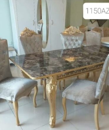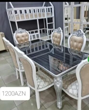 Yemək otağı üçün masa–stul dəstləri 1) Dəst 1: - Masa ölçüsü: 90x170 sm - 6 ədəd stul - Stul oturacaq hündürlüyü: 47 sm - Rəng: krem masa, tünd mavi məxməri tipli stullar - Çatdırılma pulsuz - Qiy...