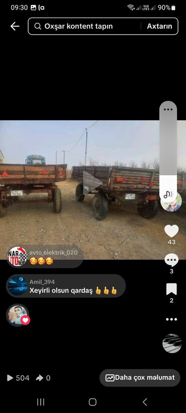 Traktor qoşqusu (2 oxlu, taxta bortlu) - Korpus: möhkəm taxta bortlar, hündür yan divarlar; arxa bort açılıb-bağlana bilir. - Ölçü və tutum: geniş daxili sahə, həcmi kənd təsərrüfatı yükləri, tiki...
