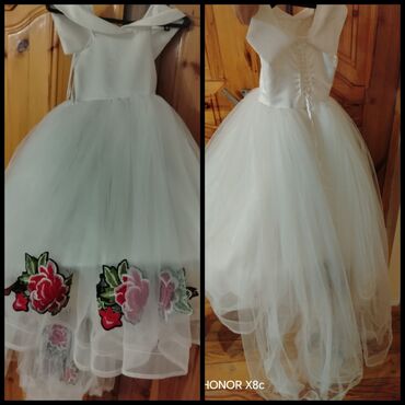 Ağ rəngli qız uşağı üçün ziyafət/əlbisə. Az geyilib. Ustanbuldan alınıb keyfiyyətli türk istehsalıdır - Model: uzun tül ətəkli, A-kəsim - Rəng: süd-ağ - Üst hissə: güpür və çiçək naxışlı aplikasiy...