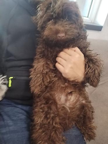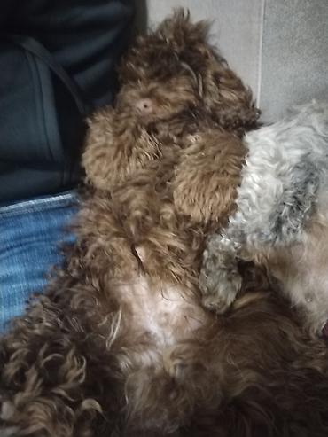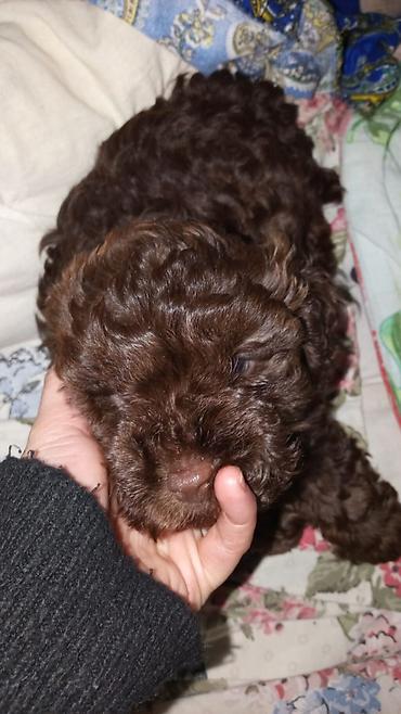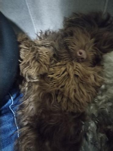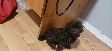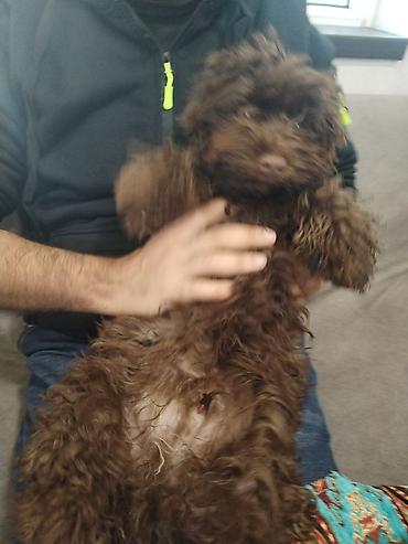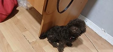 Balaca, qəhvəyi rəngli, buruq tüklü it balası.