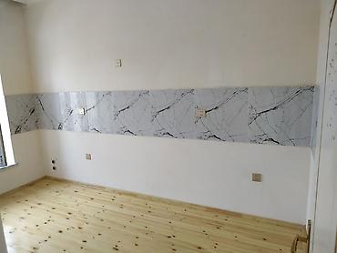 - Mətbəx otağı: divar boyunca mərmər naxışlı kafel zolağı, bir neçə elektrik çıxışı, su və qaz/elektrik avadanlığı üçün qoşulma nöqtələri.