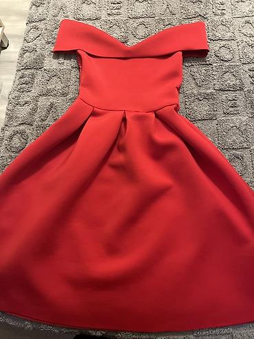 Qadın geyimi – qırmızı rəngli kokteyl/ziyafət donu - Brend: Raguel - Ölçü: 38 (etiketdə göstərilib) - Model: A-kəsim, ətəyi ətəkli, beldən açılan - Dizayn: Ön hissədə və qol hissələrində incə mirv...