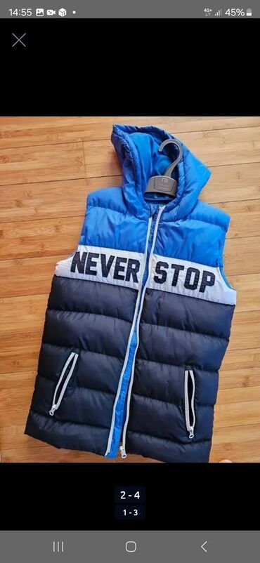 - Yüngül, kapüşonlu qolu olmayan şişmə jilet: mavi-qara keçidli rəng, ön hissədə “NEVER STOP” yazısı, iki fermuarlı yan cib.