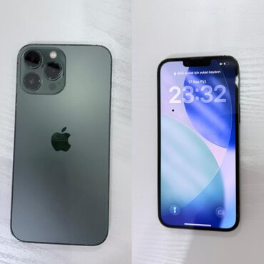 Apple iPhone 13 pro max - Rəng: tund yasıl mat şüşə arxa səth, cilalı Apple loqosu) - Korpus: düz kənarlı dizayn, möhkəm metal çərçivə - Kamera sistemi: böyük üçlü arxa kamera modulu + LED flaş; u...