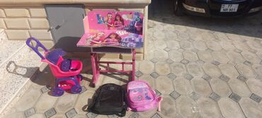 2 çanta yaxşı veziyyetde ,yazı stolu qız üçün stuluda var resimde düşmeyib,el arabası plastik de hamısı bir yerde 50 azn tek çantaların biri 30 azn alınıb