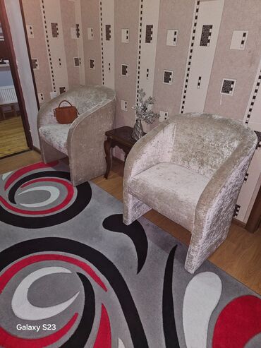 Mebel: Yumşaq kreslo dəsti (2 ədəd) - Rəng: Açıq bej/boz tonları - Material: Yumşaq, toxumalı parça (mikrofiber/velur tipli hissiyat). Yastıq və oturacaq hissəsində dekorativ düymələr - Dizayn: En...