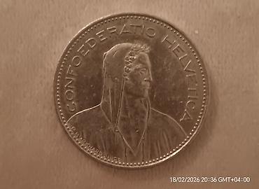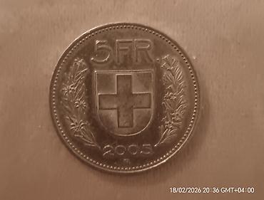 İsveçrə 5 frank sikkəsi (2005) - Valyuta: İsveçrə frankı (CHF), nominal dəyər – 5 frank. - İli: 2005. - Material: Mis‑nikel ərintisi. - Ölçü və kütlə (standart 5 FR üçün məlumat): diameter təxminə...