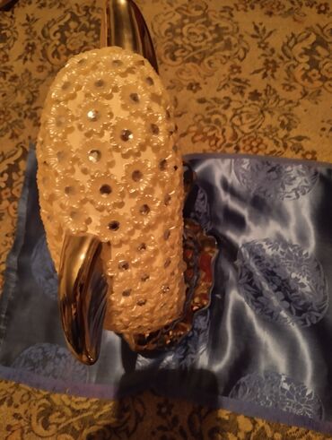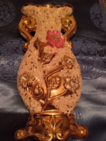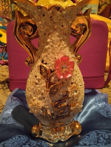Ünvandan götürmə24 k qlzıl suyu ilə işləməli,təbii mirvaridən əl işi,Svarovski daşlarla,saxsı materialdan suvenir,gül qabı.Yerində 500 $ idi.