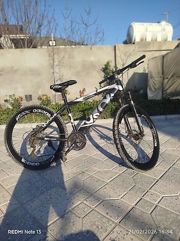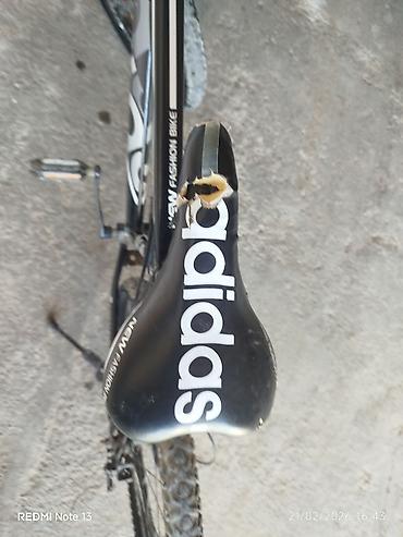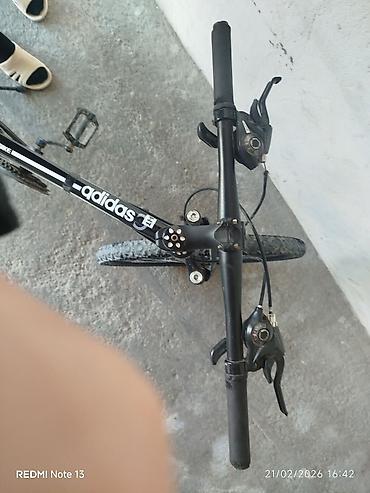 Velosiped – dağ/şosse hibrid tipli, 29”təkərli Xüsusiyyətlər: - Çərçivə: yüngül alaşımlı material, idman üslublu dizayn (qara-boz-qırmızı rəng sxemi, “adidas” loqolu dekallar) - Asqı: ön amortizat...