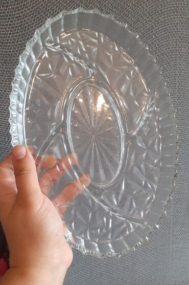 Şüşə serve qabı – uzun, oval formalı - Material: şəffaf şüşə - Forma: uzunsov/oval, ucları yumru - Dizayn: iç hissədə yarpaqvari dalğalı naxış; kənarları kəsimli (diş-diş) haşiyə - Təyinat: meyvə,...