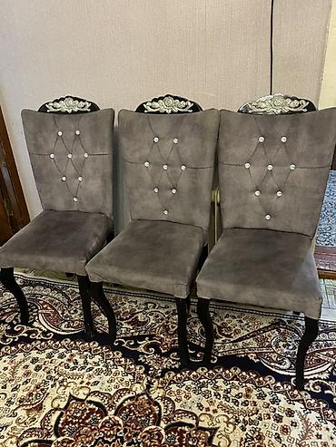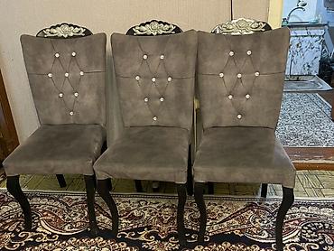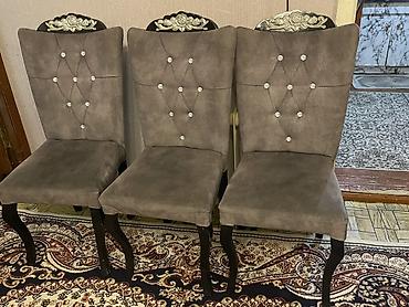 Yemək otağı üçün yumşaq oturacaqlı stullar - Model: klassik üslubda, bel hissəsi hündür, oturacaq yumşaq - Rənglər: tünd boz və firuzə (şəkillərdə) - Parça: məxmər/velur tipli yumşaq toxuma, toxun...