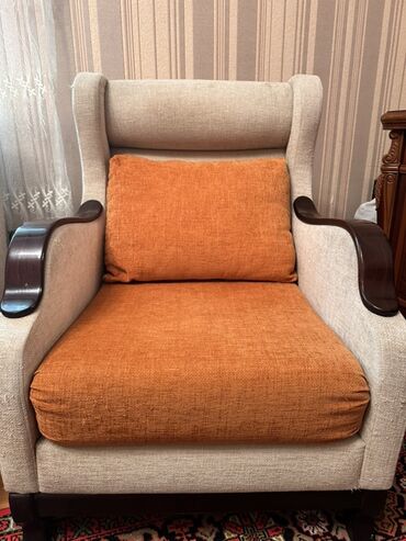 - Rənglər: bej karkas/üzlük, narıncı oturacaq və söykənəcək yastıqlar; tünd qəhvəyi taxta qollar və ayaqlar