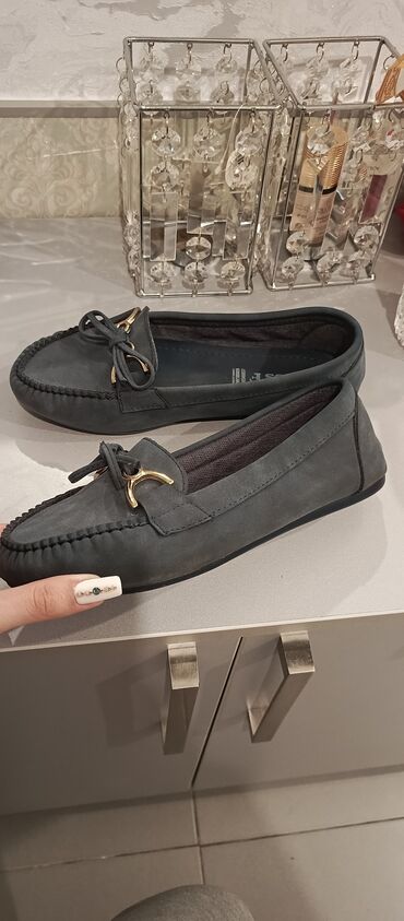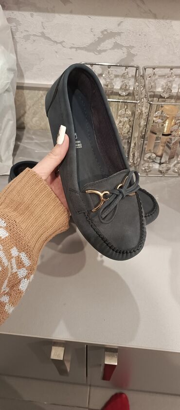 Yeni,(eqadan alınıb)40 razmer,üstü göy parçalı,qadın üçün lofer ayaqqabı(yaxın ərazi və metro xətti üzrə çatdırılma)