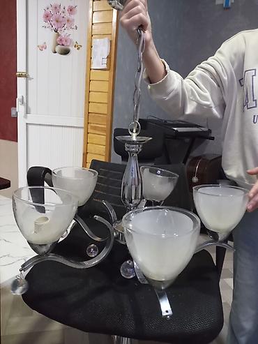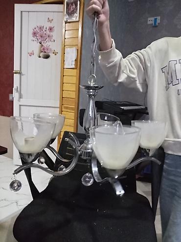 Tavan lustrası - 5 qolllı tavan lampası 2 eded var,tam islekdi,az islenib - Korpus: metal, xrom rəng - Plafonlar: mat ağ şüşə, həndəsi formalı, dekorativ perforasiya ilə - Asma zəncir və montaj əs...