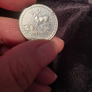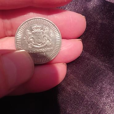 - 20 tetri nominalı – ön üzdə maral təsviri, kənar naxışlı haşiyə və “20” rəqəmi, gürcü əlifbası ilə yazı.