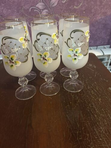 Bu dekorativ şüşə qədəhlər zərif dizaynı ilə seçilir. Hər qədəhin xarici səthi qızılı rəngdədir və üzərində incə naxışlar, çiçək motivləri var. İç hissəsi isə tünd yaşıl rəngdədir. Bu qədəhlər este...