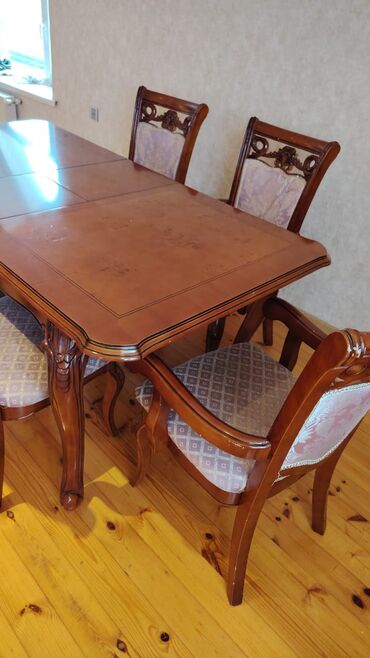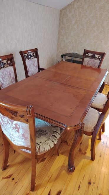 - Dəst: düzbucaqlı masa + 6 stul (2 ədəd qoltuqlu, 4 ədəd qoltuqsuz)