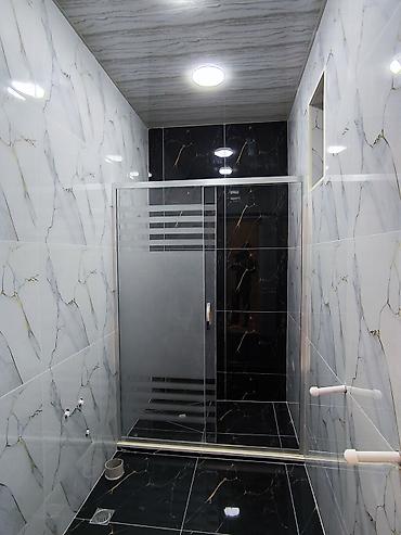 - Sanuzel/hamam: Tam kafel-metlax, duş kabinəsi şüşə qapılı, asma tavan və spot işıqlandırma, döşəmədə trap.