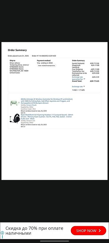 - Şəkildə Amazon sifariş xülasəsi mövcuddur: “8BitDo Ultimate 2C Wireless Controller for Windows PC and Android, with 1000 Hz Polling Rate, Hall Effect Joysticks and Triggers, and Remappable L4/R4 Bumpers (Green)”.
