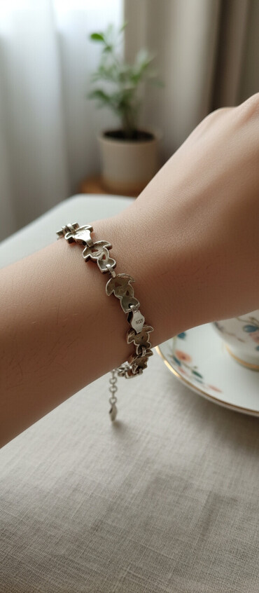 925 damğa ilə gümüş qolbaq - Material: 925 əyar sterling gümüş (birləşmə hissəsində “925” damğası var) - Dizayn: Bir-birinə halqalarla bağlanan ardıcıl fiqurlu elementlər (çiçək/güllə oxşar kontur...