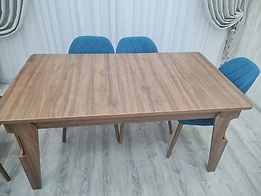 - Stullar: 4 ədəd mavi rəngli oturacaq. Arxalıq romb tikişli (kapitone effektli), yumşaq süet/velur tipli parça ilə üzlənmə. Taxta ayaqlar masanın tonuna uyğundur.